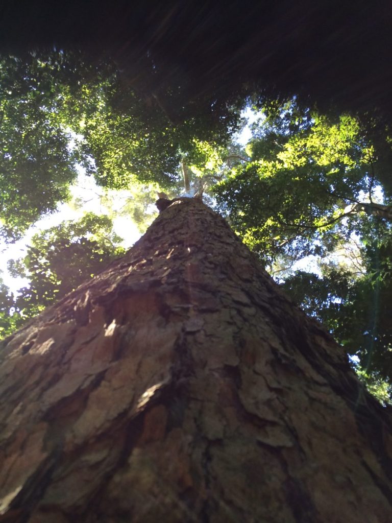 It has rough brown bark on lower trunk and smooth pinkish brown bark on upper trunk and branches.