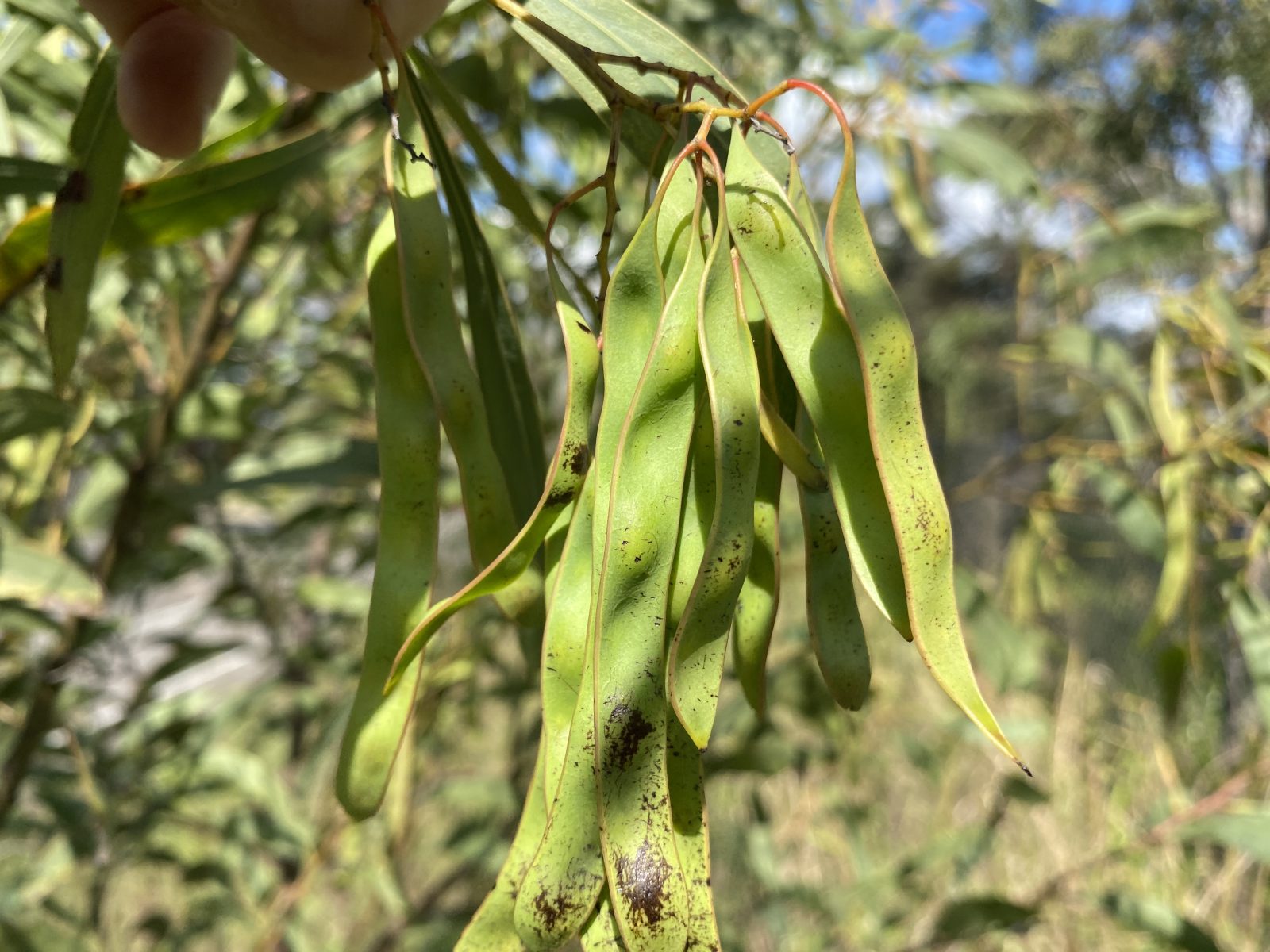 These are followed by thin seed pods which are to 12 cm long and 1 cm wide. The pods mature from September to December.