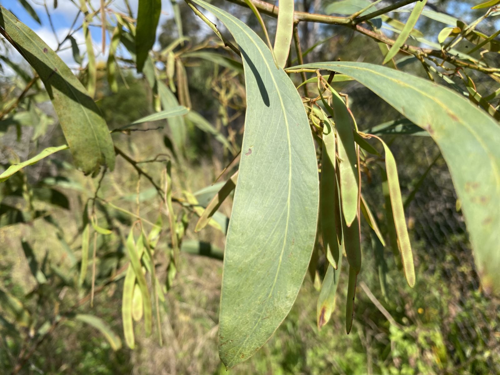 The phyllodes (modified leaves) are a pale green or grey-green and sickle-shaped, measuring to 20 cm in length, by 4 cm wide with a prominent mid vein.