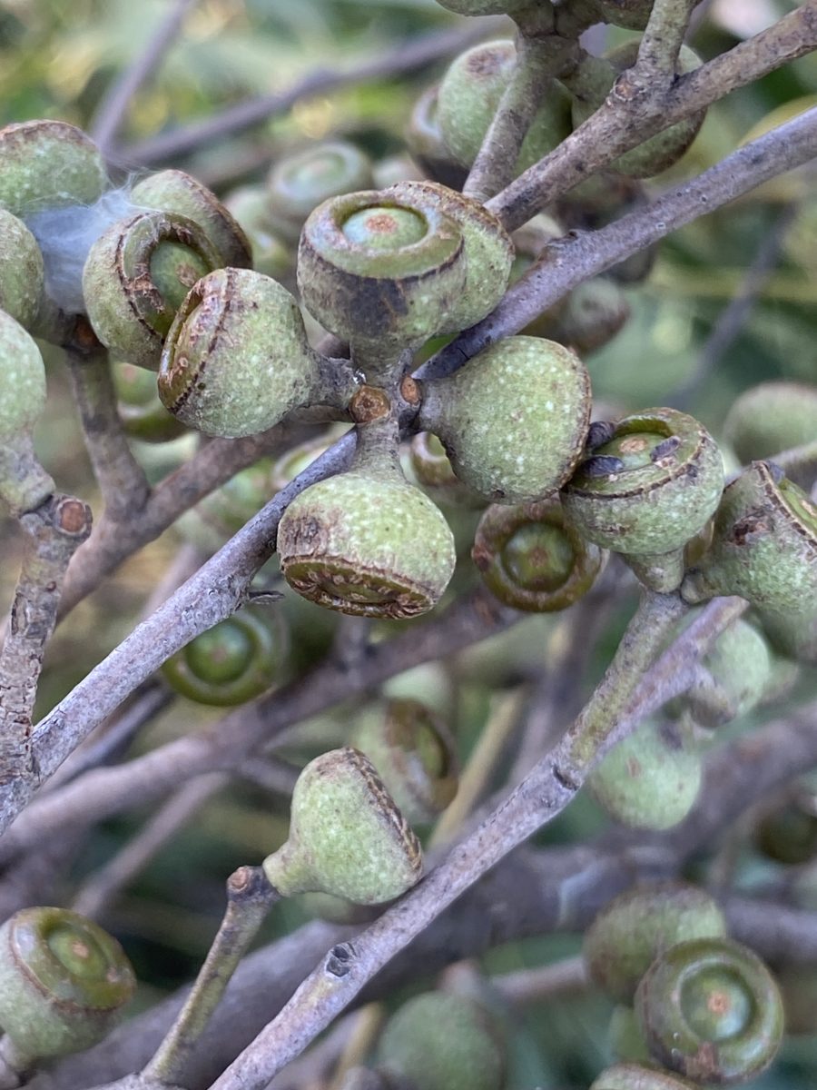 Eucalyptus – from Greek, eu, “well” or “true” and calyptus, referring to the calyptra (καλύπτρo) or operculum, which is a bud cap or covering which covers the developing flowers. The calyptra is a fusion of petals and/or sepals and is shed when the flower opens, leaving a flower with many stamens (staminate) surrounding one female part (carpel).