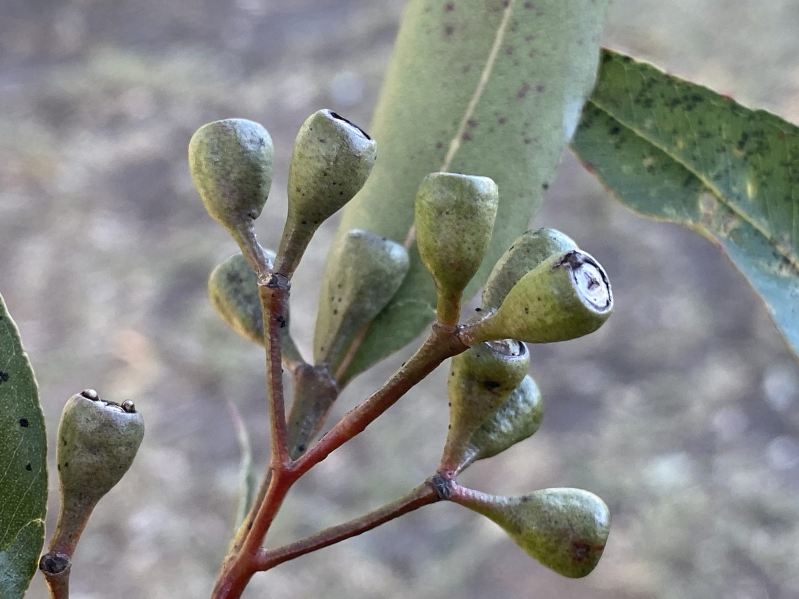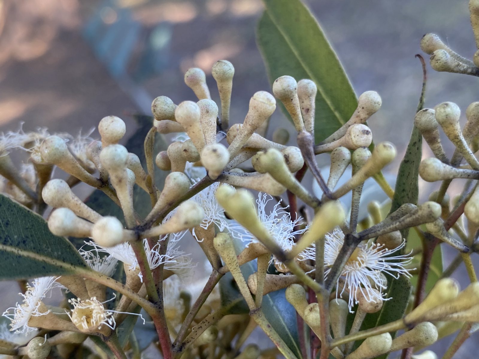 The primary inflorescence of “eucalypts” (Angophora / Corymbia / Eucalyptus) is an umbellaster (an umbel-like cluster of flowers). In the flowers of Corymbia and Eucalyptus, the petals and sepals are fused into the distinctive calyptra / operculum (bud cap) which is shed when the flower opens (in some species, 2 bud caps (opercula) are shed). The flowers are conspicuously staminate – where many stamens are basically taking over the role of the petals, all surrounding one central carpel. In this species, the flower buds are arranged in leaf axils in umbellasters of 7-11 or more. Mature buds are clavate (club-shaped) to 6 mm long and 3 mm wide, each with a small hemispherical operculum / calyptra. Flowers are white to lemon-yellow and occur mainly in spring and summer.